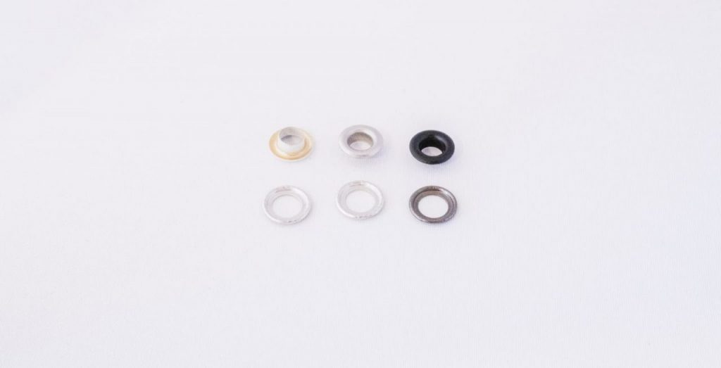 铆眼(ハトメ)由两部分组成,打上去后会在材料上形成一个孔的金属配件。通常通过机器打孔安装。它可用作穿过绳索的孔或通风孔,常用于卫衣帽子、卫裤腰部等部位。