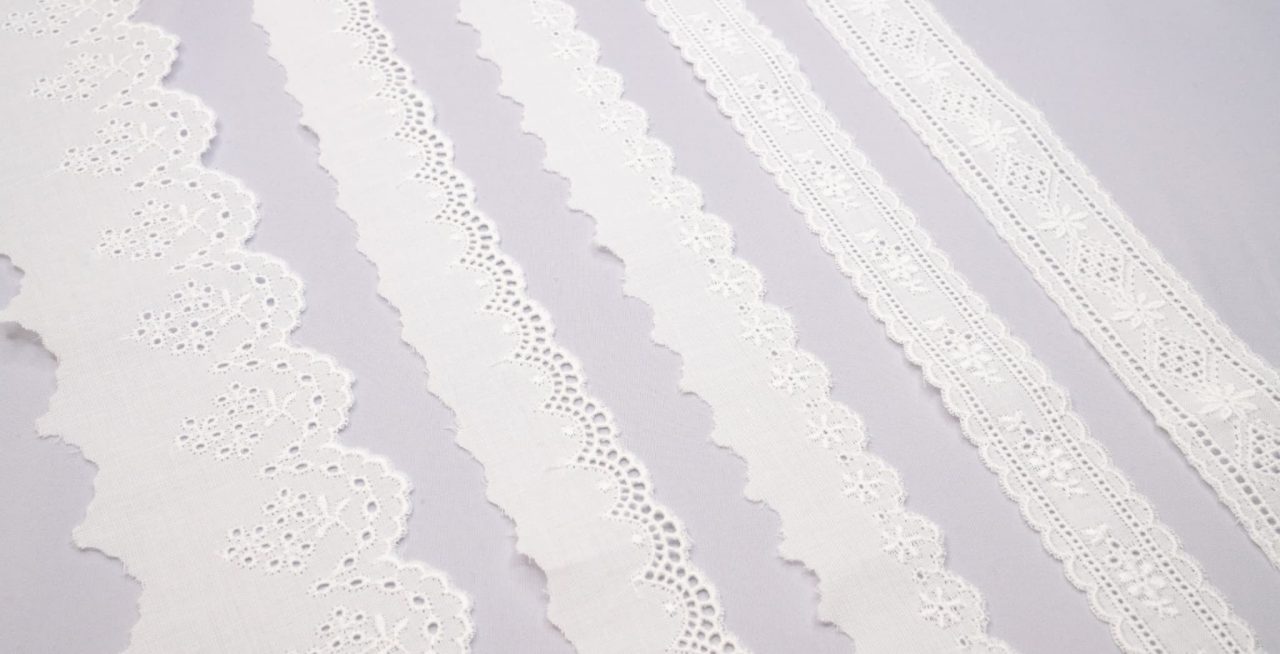 刺绣蕾丝是在棉布底料上进行刺绣装饰后,再裁切成带状的蕾丝产品。